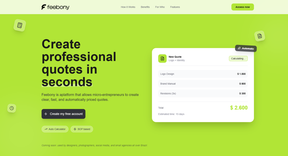 Feebony is aplatform that allows micro-entrepreneurs to create clear, fast, and automatically priced quotes.